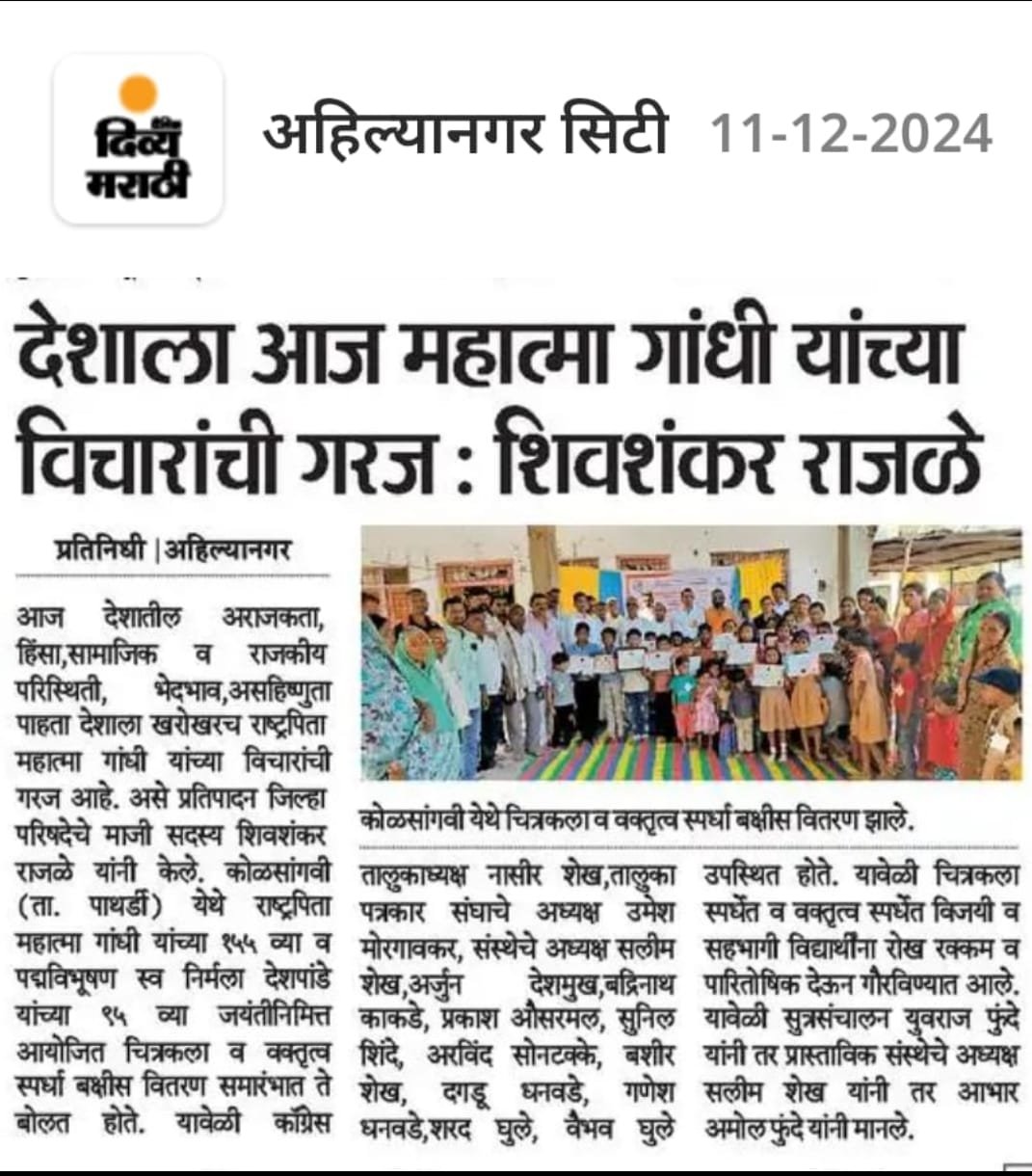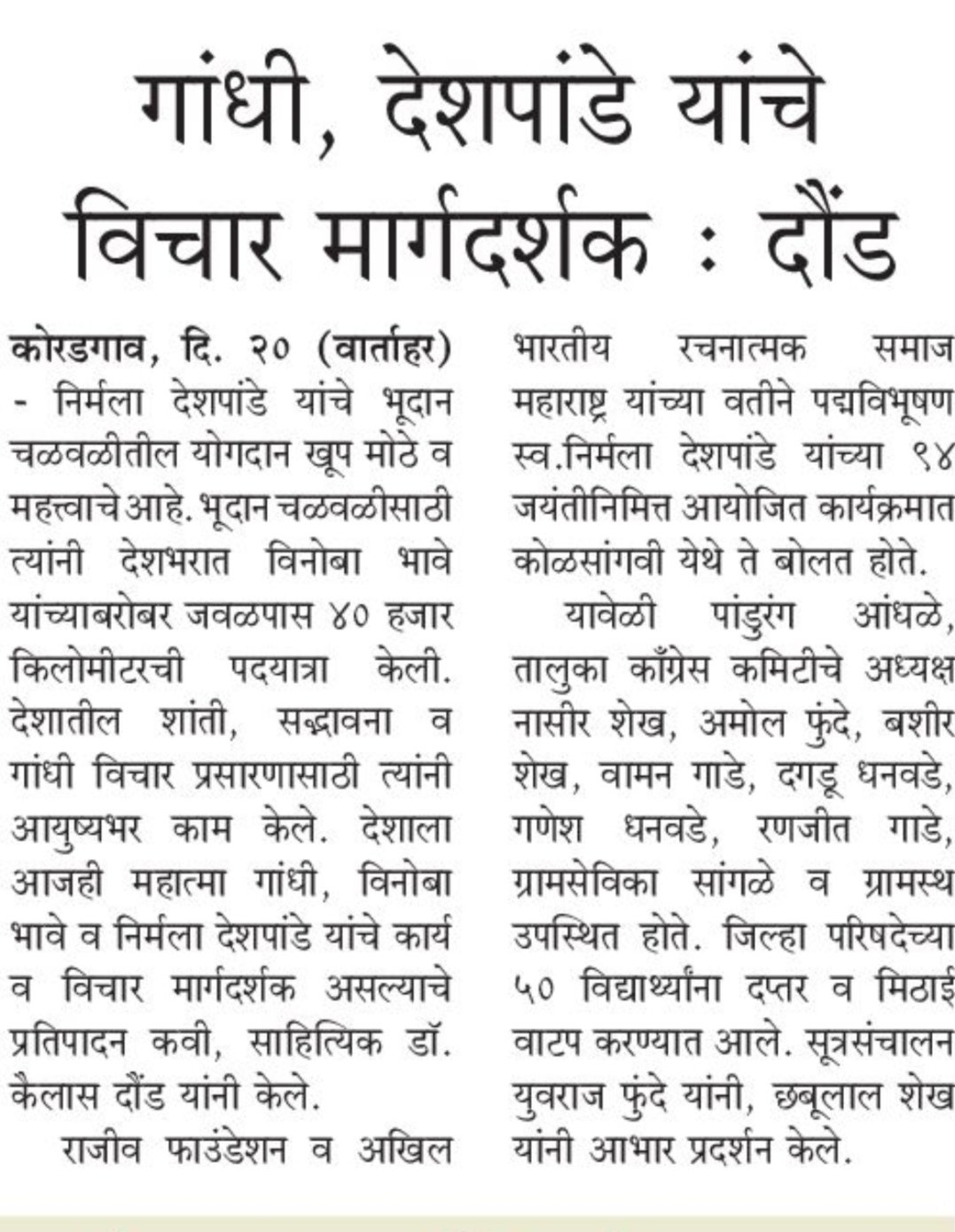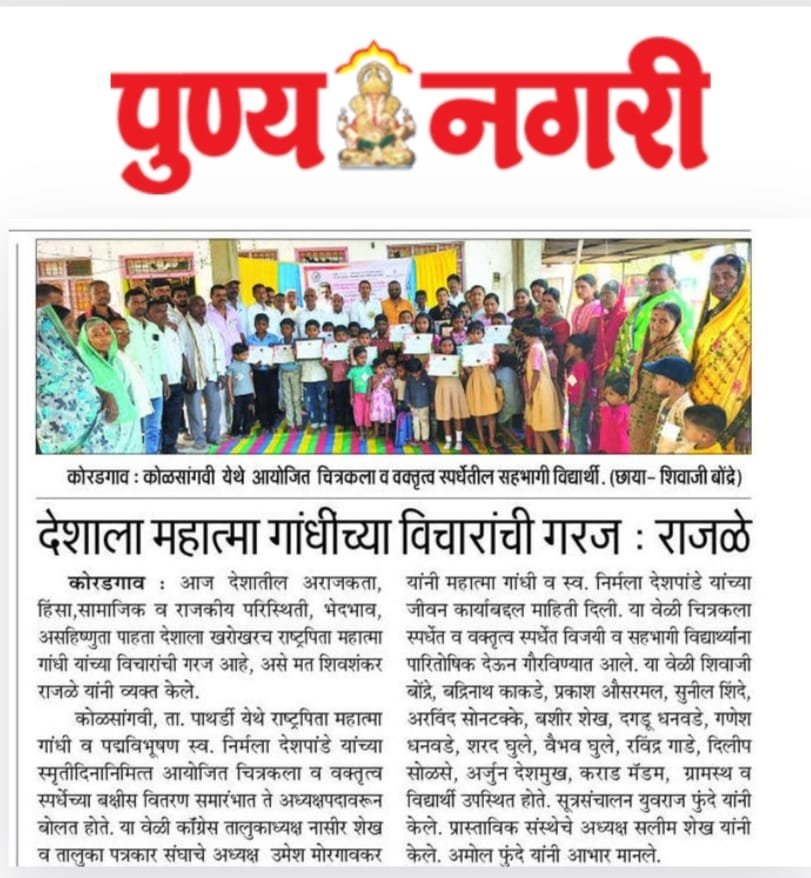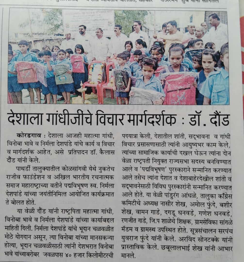 On the occasion of the 155th birth anniversary of the Father of the Nation, Mahatma Gandhi and the 95th birth anniversary of Padma Vibhushan Late Nirmala Deshpande (Didi) at Kolsangvi, Post- Koradgaon, Tal- Pathardi, Dist- Ahmednagar