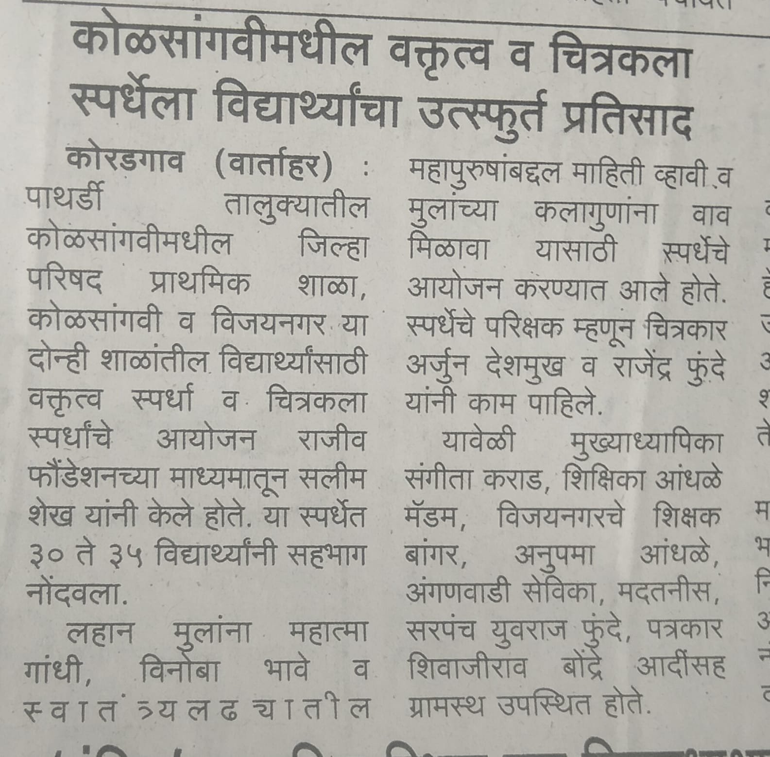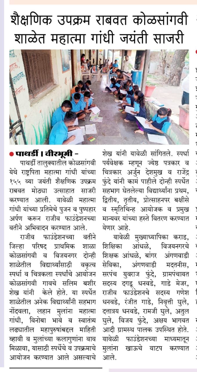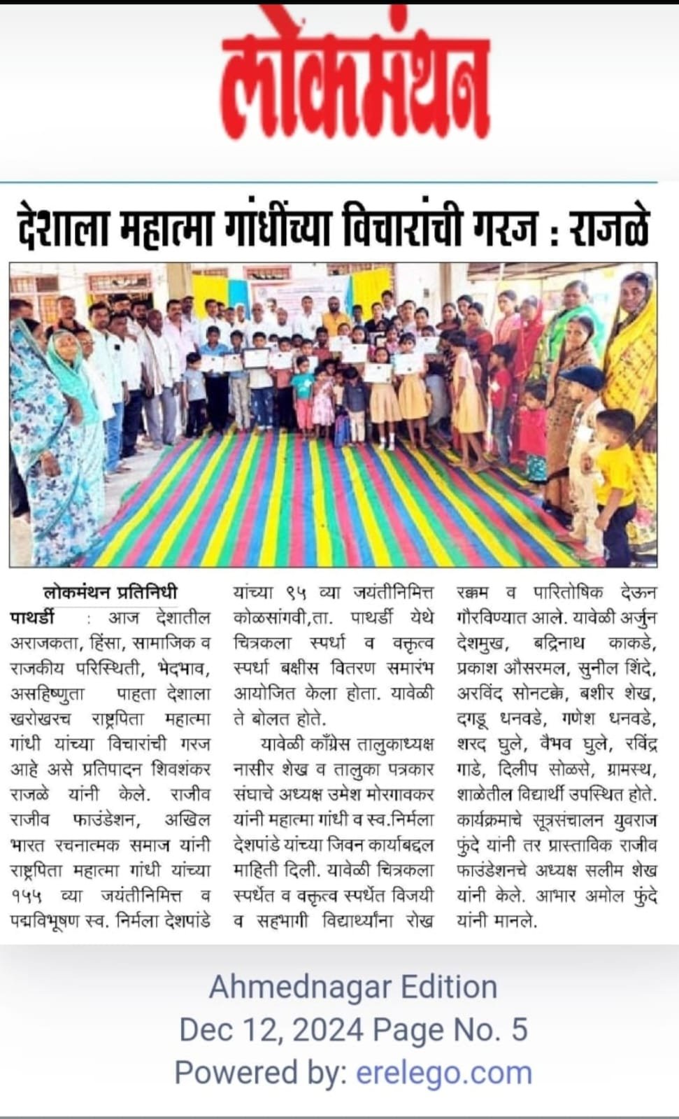 On the occasion of the 155th birth anniversary of the Father of the Nation, Mahatma Gandhi and the 95th birth anniversary of Padma Vibhushan Late Nirmala Deshpande (Didi) at Kolsangvi, Post- Koradgaon, Tal- Pathardi, Dist- Ahmednagar